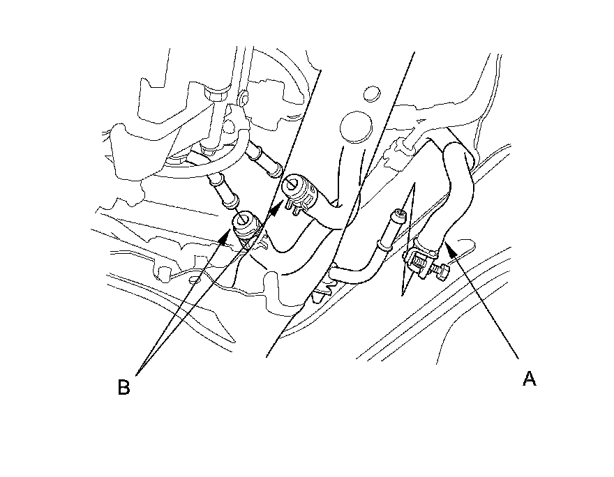 30. Install the power steering (P/S) hose (A) and the ATF cooler hoses (B).