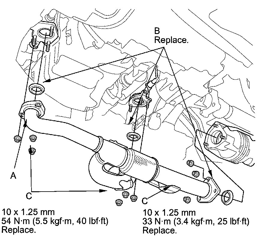 34. Install exhaust pipe A using new gaskets (B) and new self-locking nuts (C). Tighten the nuts to the specified torque.