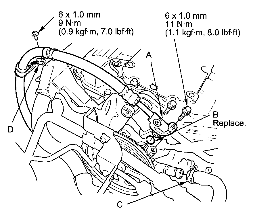 42. Install the P/S pump outlet hose (A) using a new O-ring (B), and install the P/S pump inlet hose (C).