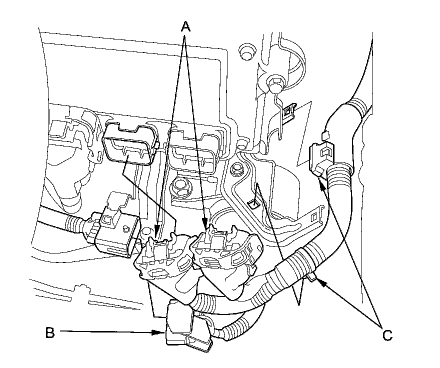 45. Connect the powertrain control module (PCM) connectors (A) and the engine wire harness connector (B), then install the harness clamps (C).