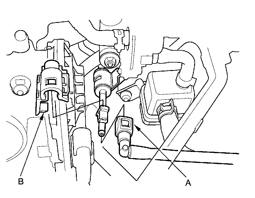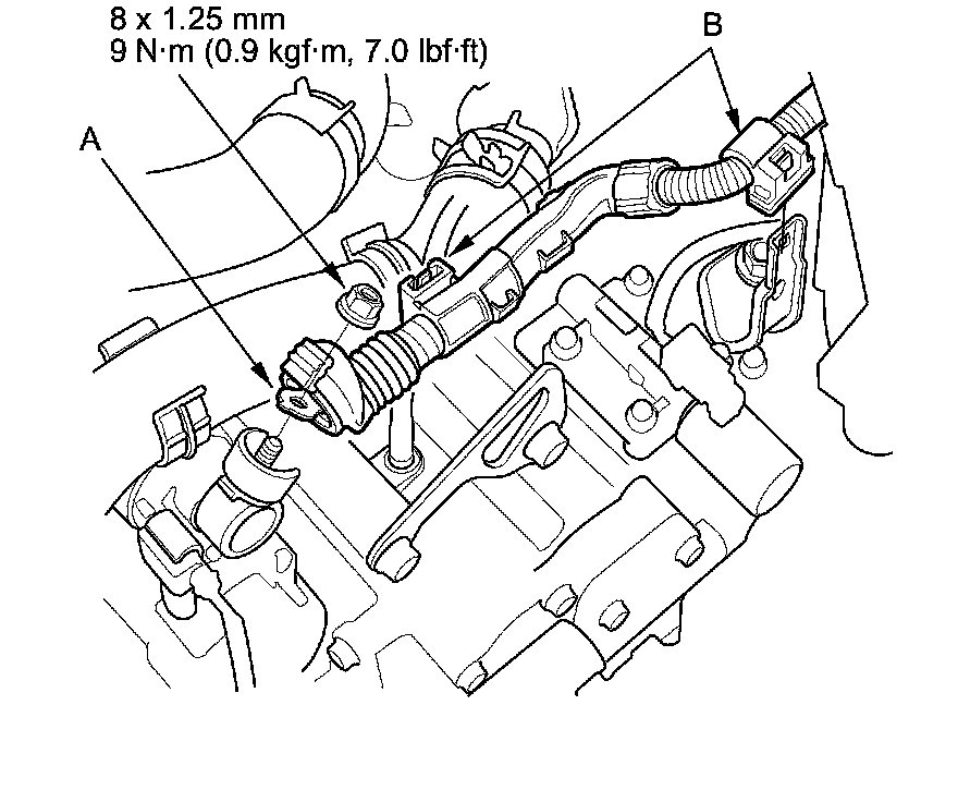 51. Connect the brake booster vacuum hose (A) and the evaporative emission (EVAP) canister hose (B).
