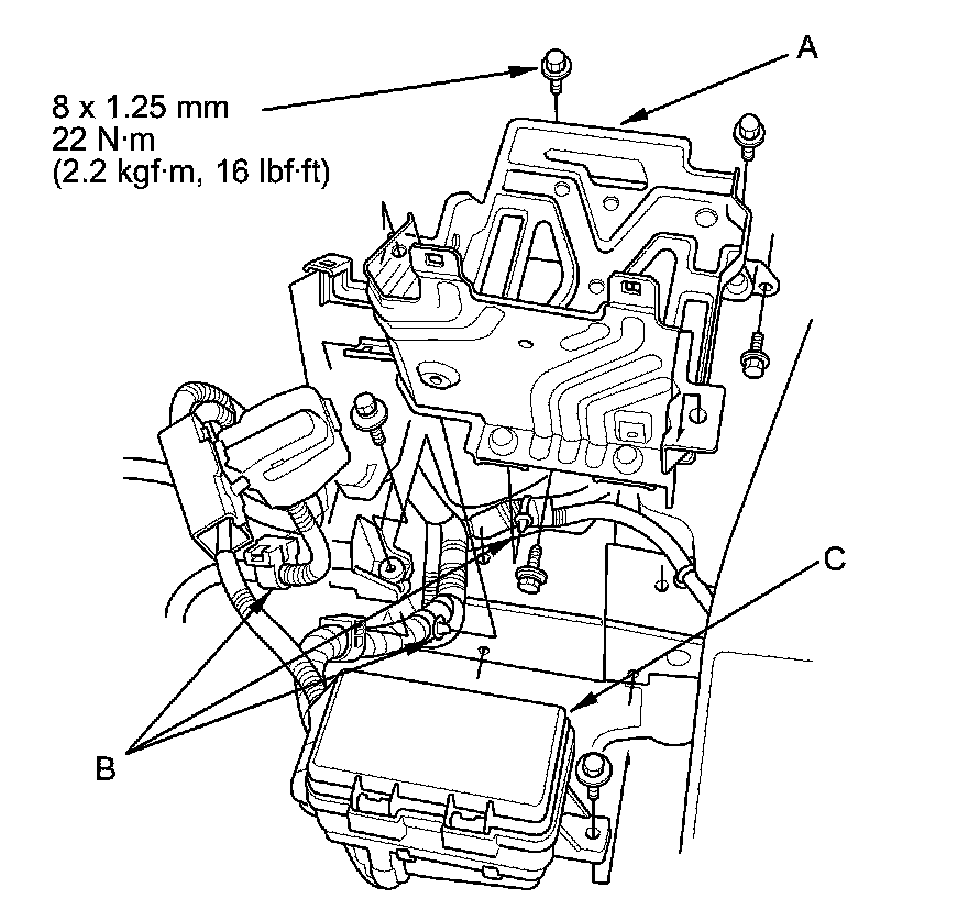 56. Install the battery base (A), then install the harness clamps (B) and the auxiliary under-hood fuse/relay box (C).