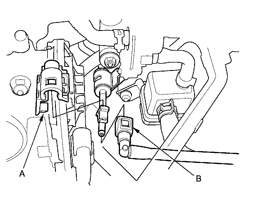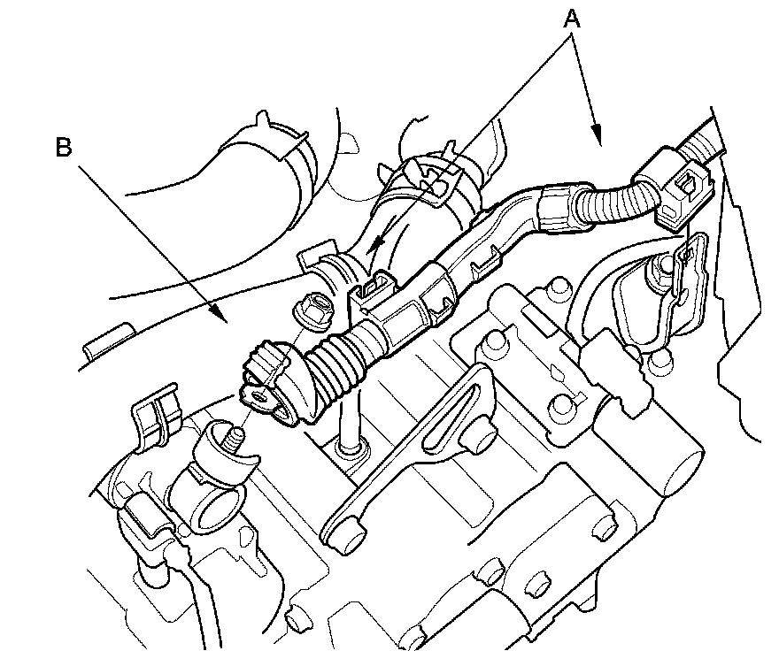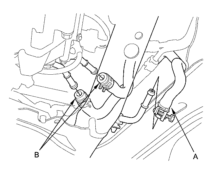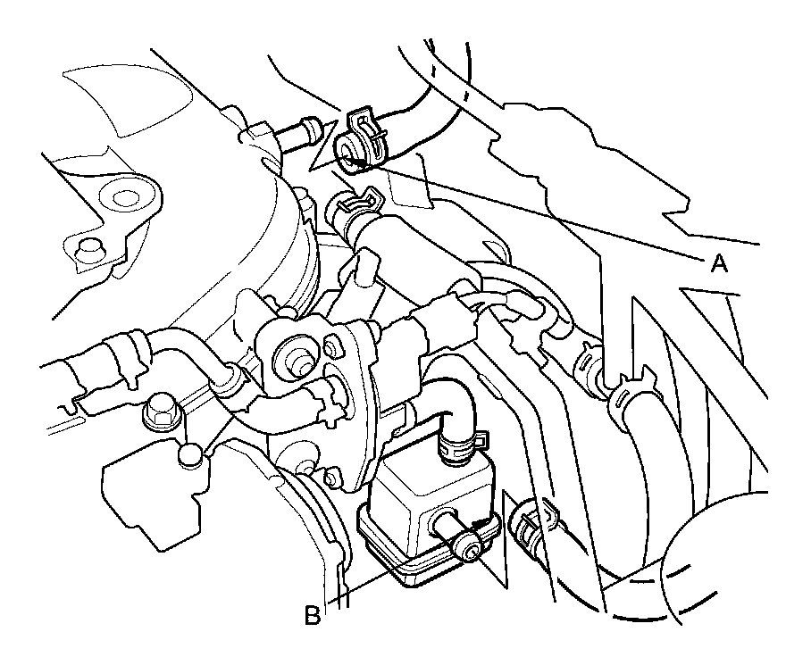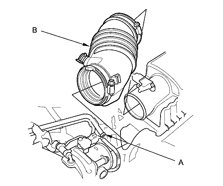 14. Disconnect the brake booster vacuum hose (A), and the evaporative emission (EVAP) canister hose (B).