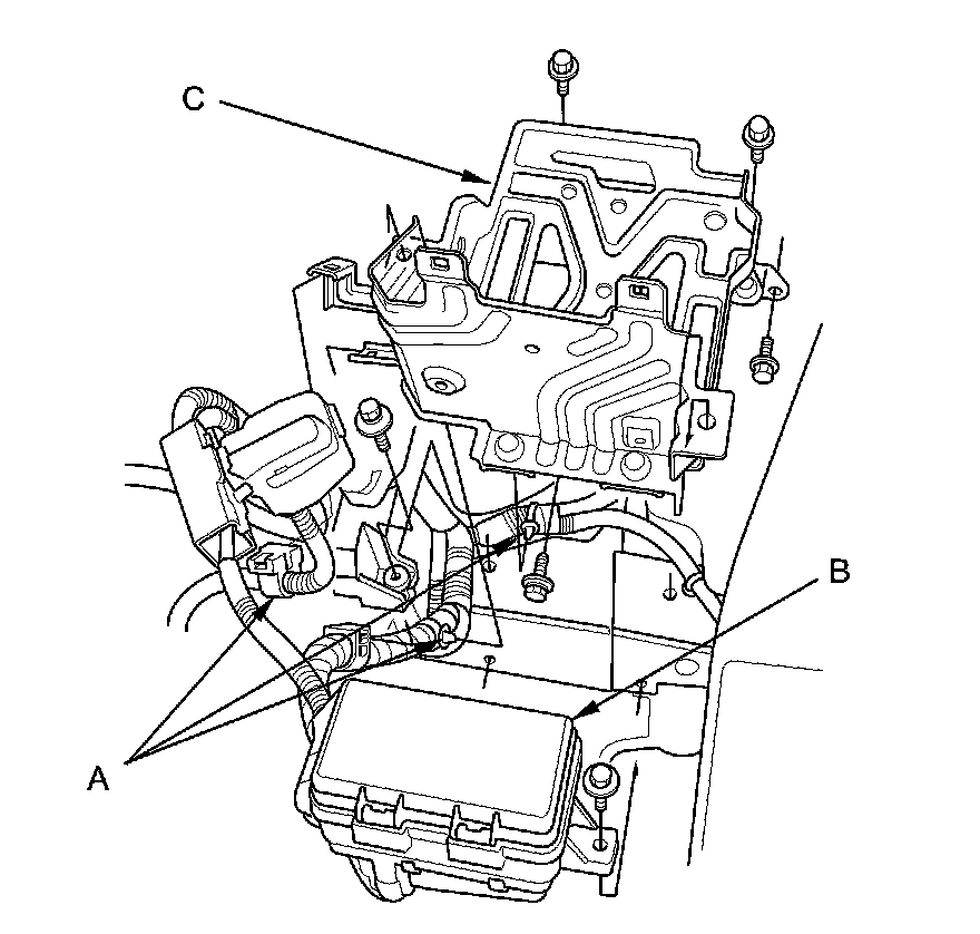 9. Remove the harness clamps (A), and the auxiliary under-hood fuse/relay box (B), then remove the battery base (C).
