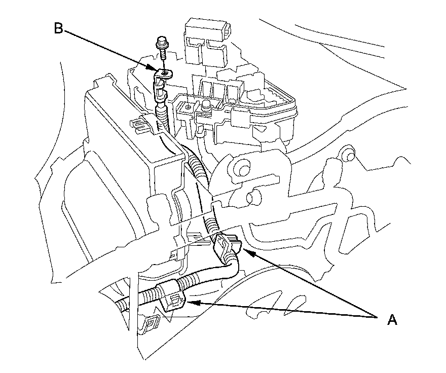 18. Remove the harness clamps (A), then disconnect the positive alternator cable (B) from the under-hood fuse/relay box.