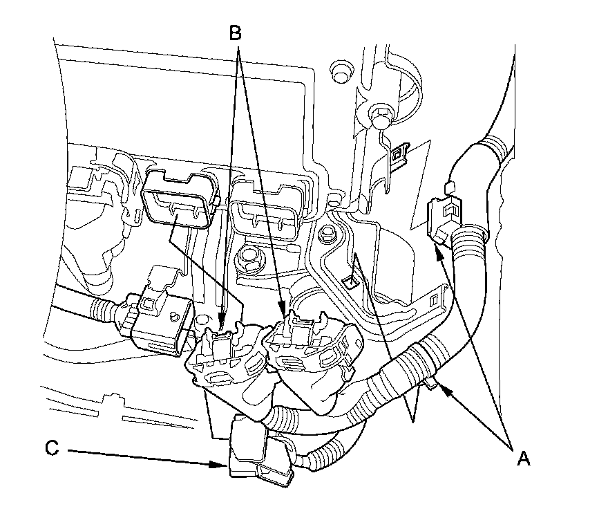 20. Remove the harness clamps (A), then disconnect the two PCM connectors (B) and the engine wire harness connector (C).