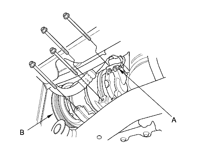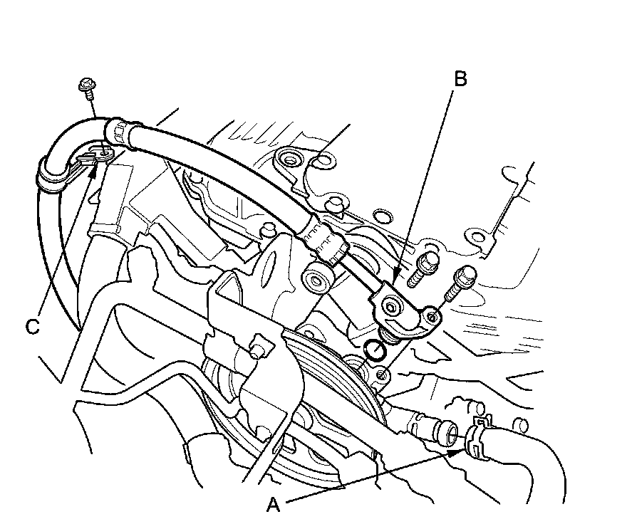 22. Remove the power steering (P/S) pump inlet hose (A) and the P/S pump outlet hose (B) from the P/S pump, then plug the P/S lines and the P/S pump.