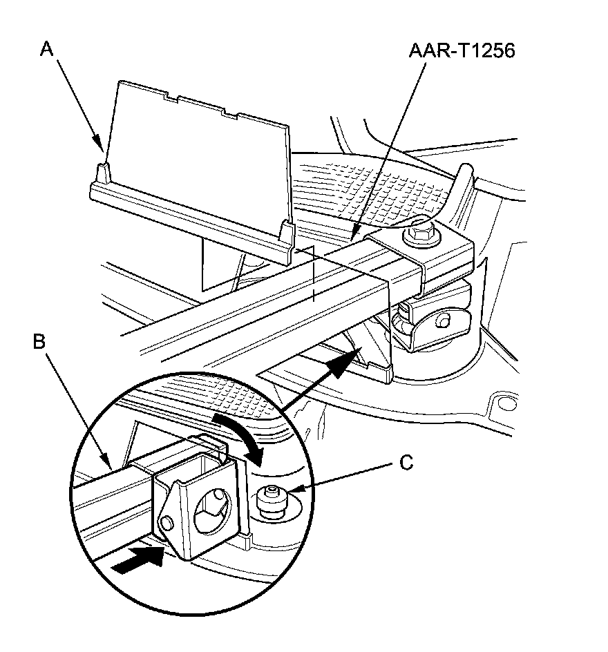 44. With the engine support hanger (AAR-T1256) on its side, insert the hanger beam (B) through the opening, then rotate it over the damper (C).