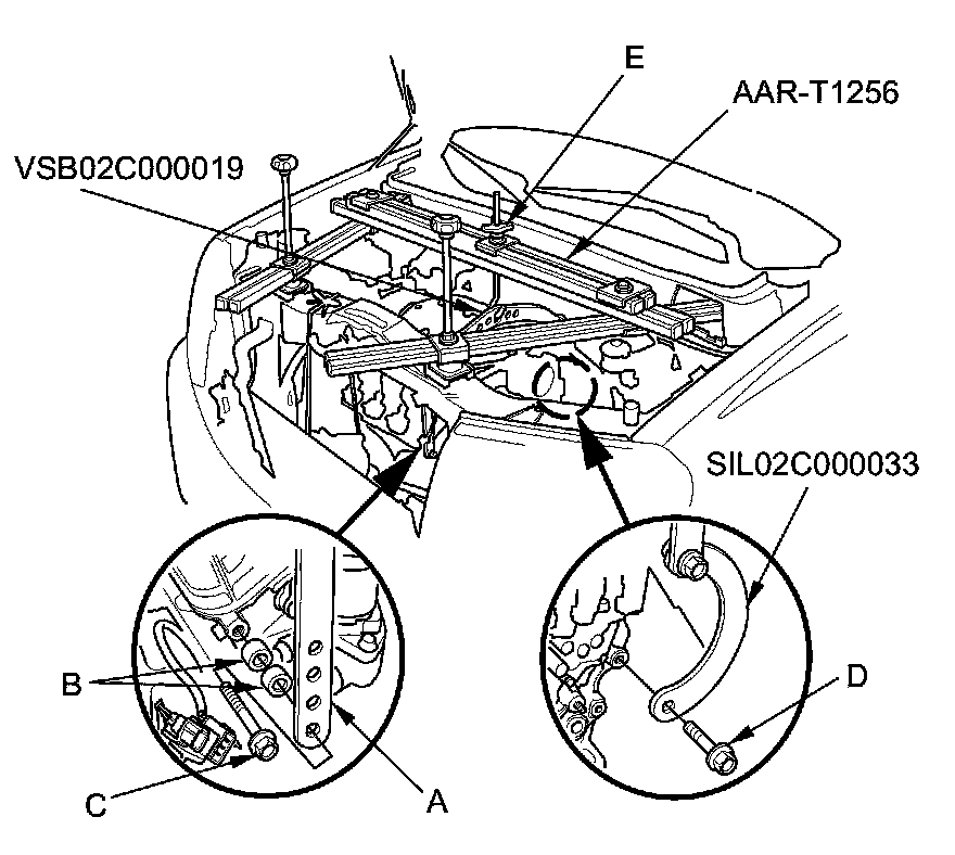 46. Install the engine support hanger (AAR-T1256) onto the vehicle as shown, and attach the hook to the slotted hole in the engine hanger balance bar. Tighten the wing nut (E) by hand, and lift and support the engine/transmission.