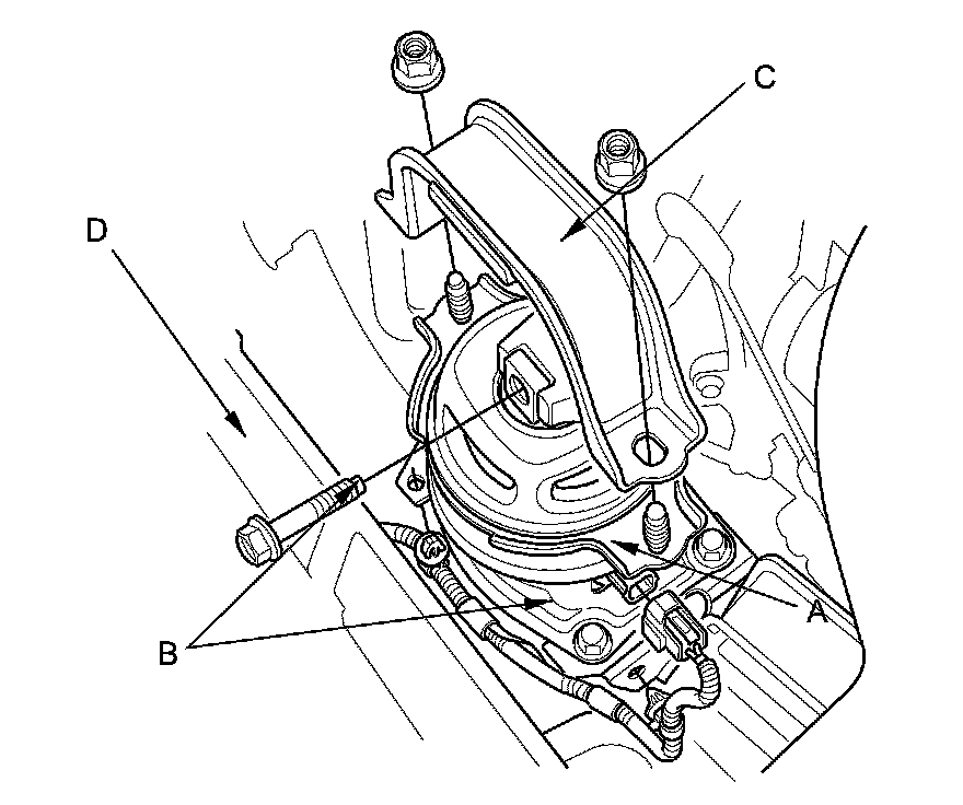 47. Disconnect the front engine mount actuator connector (A) and the harness clamps (B). Remove the front engine mount stop (C), then remove the front engine mount bolt (D).