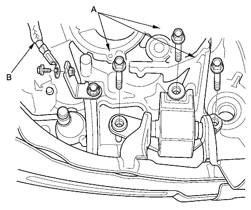 50. Remove the lower transmission mount bolts (A) and the ground cable (B).