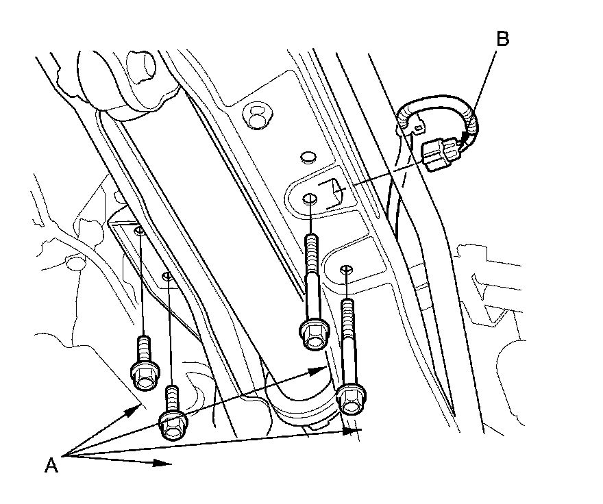 51. Remove the rear engine mount bolts (A) and disconnect the rear engine mount actuator connector (B).
