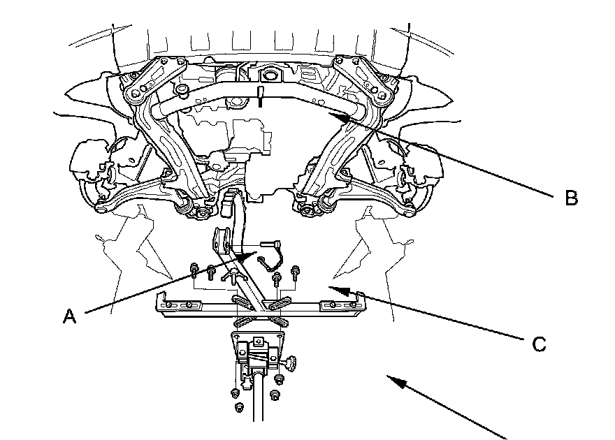 52. Attach the subframe adapter (VSB02C000016) to the subframe by looping the belt (A) over the front of the subframe (B), then secure the belt with its stop (C).