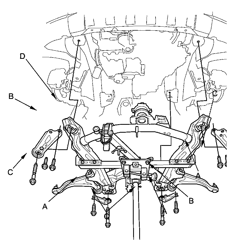 54. Remove the six 12 x 1.25 mm bolts (A) securing the subframe stiffeners (B), the four subframe mounting bolts (C), and the stiffeners, then lower the front subframe (D).