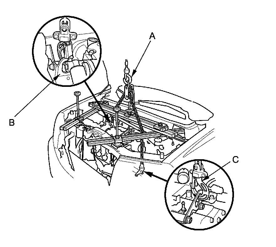 56. Attach a chain hoist (A) to the engine hanger (B) and the transmission hanger (C), then lift the