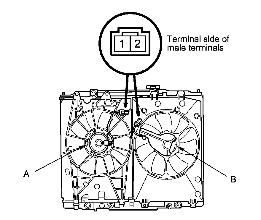 Disconnect the 2P connectors from the radiator fan motor (A) and the A/C condenser fan motor (B).