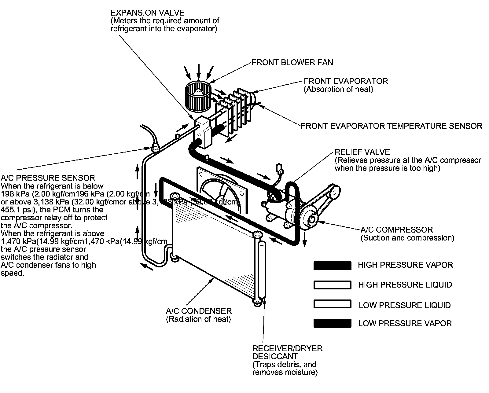 NOTE: When the refrigerant is below 196 kPa (2.00 kgf/cm2, 28.4 psi) or above 3,138 kPa (32.00 kgf/cm2, 455.1 psi), the PCM turns the compressor relay off to protect the A/C compressor. When the refrigerant pressure is above 1,470 kPa (14.99 kgf/cm2, 213.2 psi), the PCM switches the radiator and A/C condenser fans to high speed.