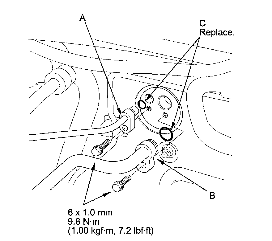 3. Remove the bolts, then disconnect the front receiver line (A) and the front suction line (B) from the front evaporator core. Remove the O-rings (C).