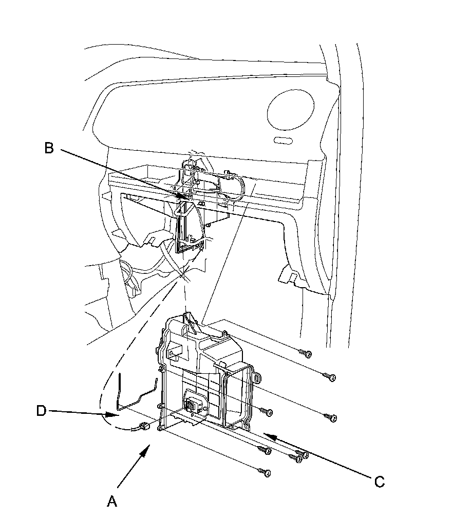 5. Disconnect the connector (A) from the front power transistor, then remove the harness clip (B). Remove the self-tapping screws, the expansion valve cover (C), and the seal (D).
