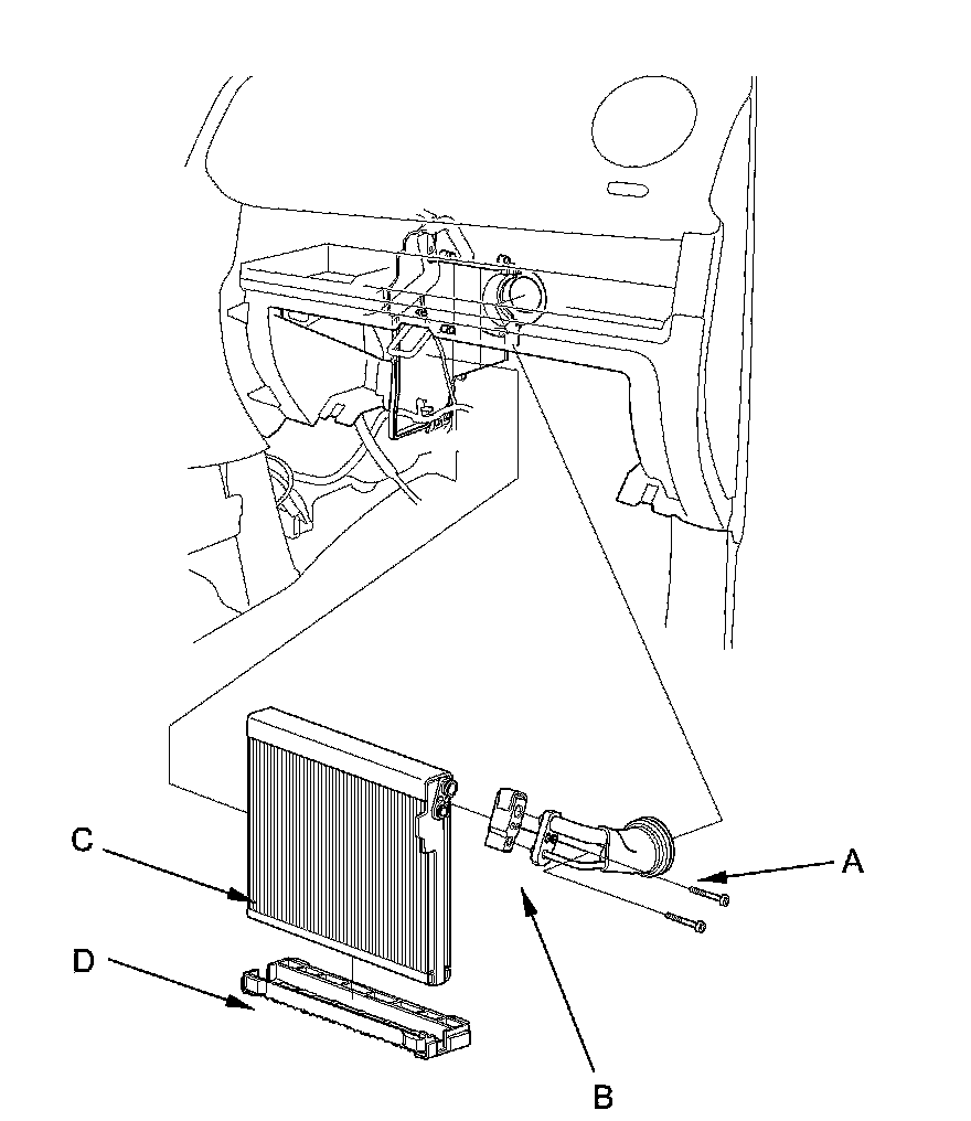6. Remove the bolts, the inlet and outlet pipes (A), and expansion valve (B). Carefully pull out the front evaporator core (C), then remove the plate (D).