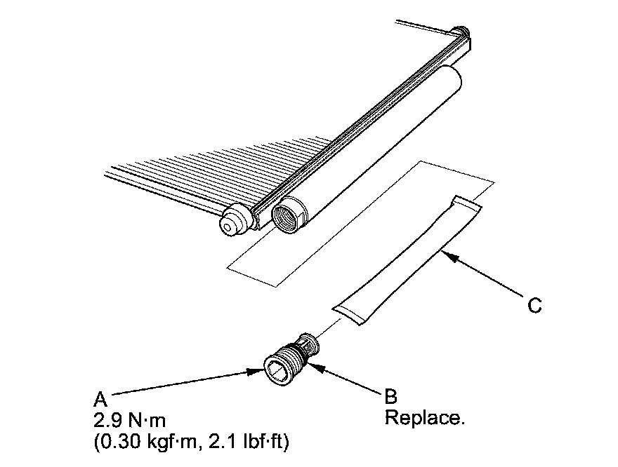 2. Remove the cap (A) from the bottom of the A/C condenser. Remove the O-ring (B) and the desiccant (C).