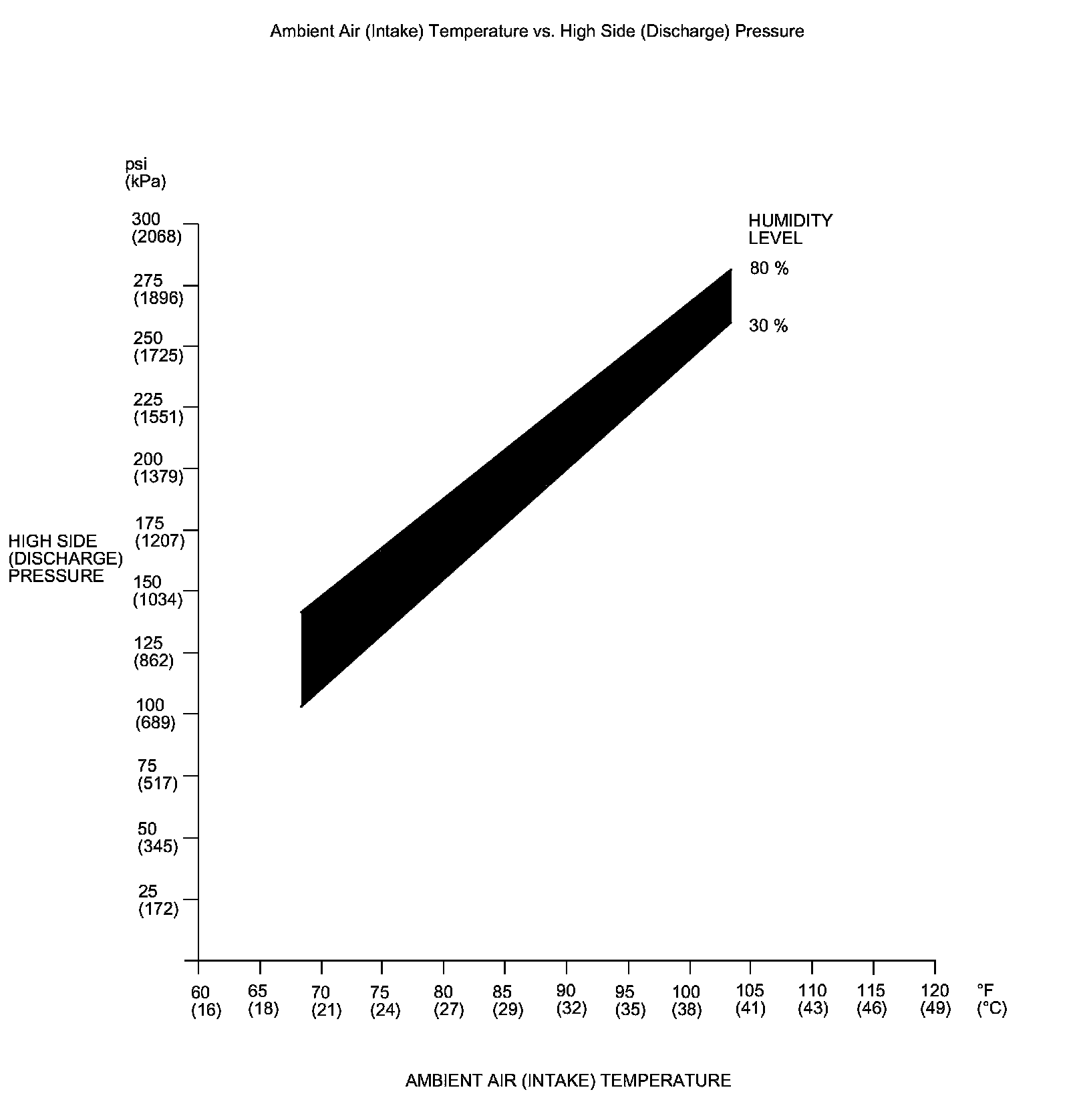 NOTE: The high side pressure and ambient air temperature should intersect in the shaded area. Any measurements outside the line may indicate the need for further inspection.