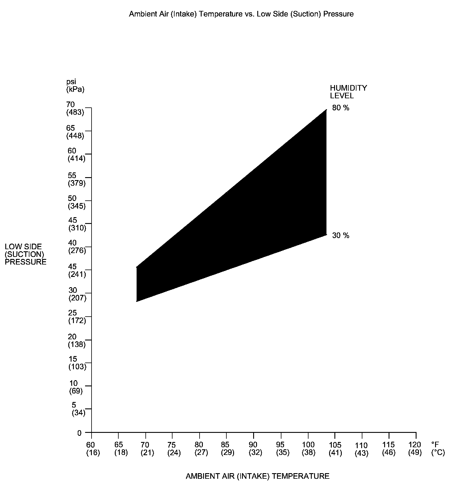 NOTE: The low side pressure and ambient air temperature should intersect in the shaded area. Any measurements outside the line may indicate the need for further inspection.