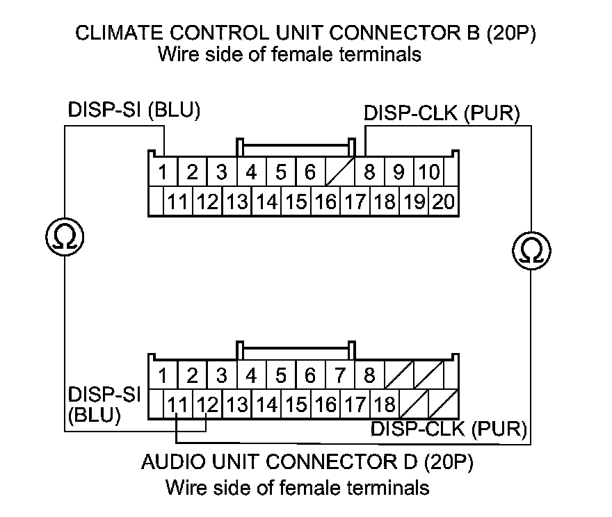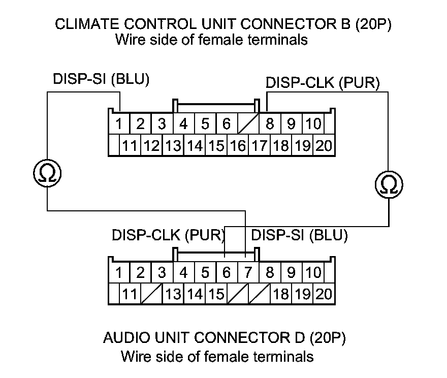 3. Check for continuity between the following terminals of climate control unit connector B (20P) and audio unit connector D (20P).
