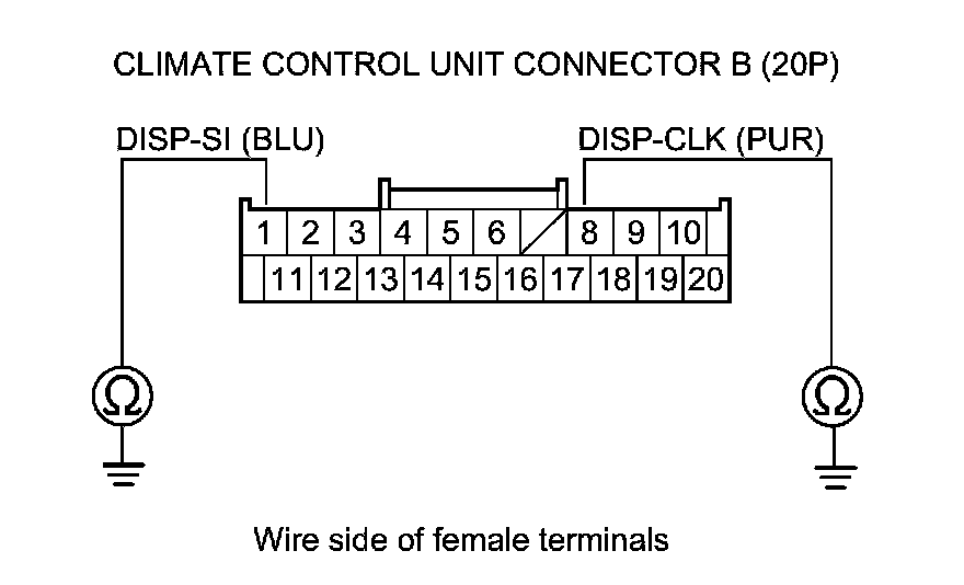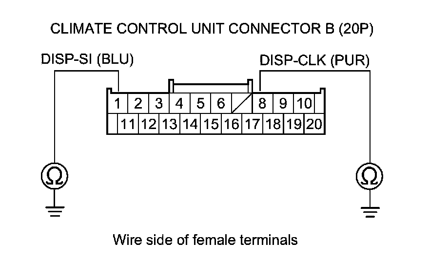 12. Check for continuity between body ground and climate control unit connector B (20P) terminals No. 1 and No. 8 individually.
