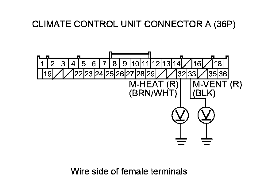 8. Check for continuity between body ground and climate control unit connector A (36P) terminals No. 32 and No. 33 individually.
