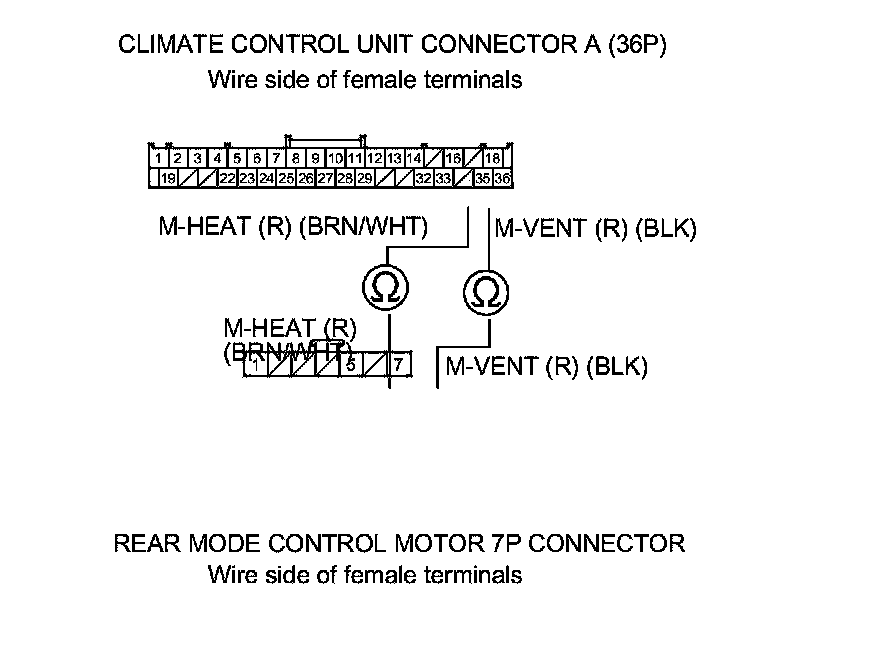 11. Check for continuity between the following terminals of climate control unit connector A (36P) and the rear mode control motor 7P connector.
