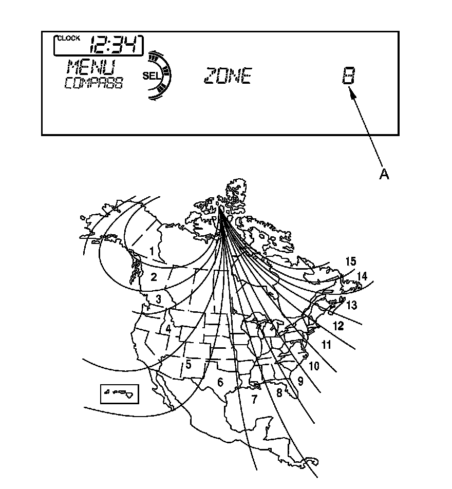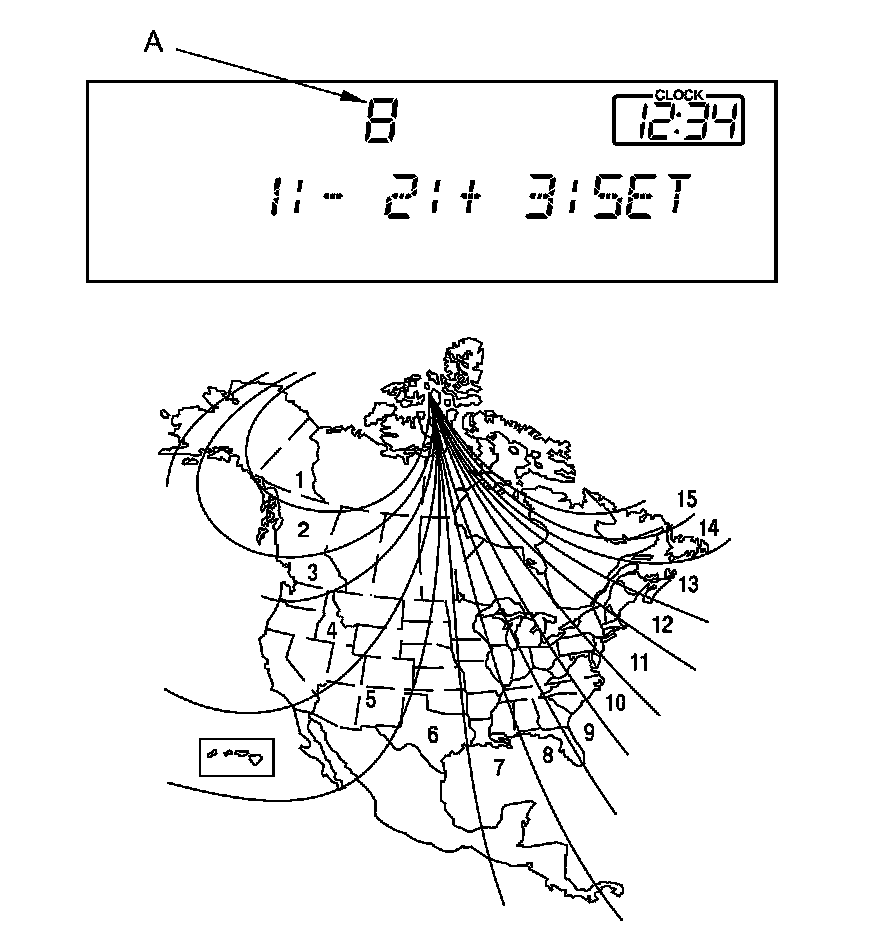 3. The display shows the currently selected zone number (A) between 1 and 15. Find the zone for your area on the zone map. If the correct zone is not shown, push the preset button No. 1 (lists down) or No. 2 (lists up) to select the correct zone.