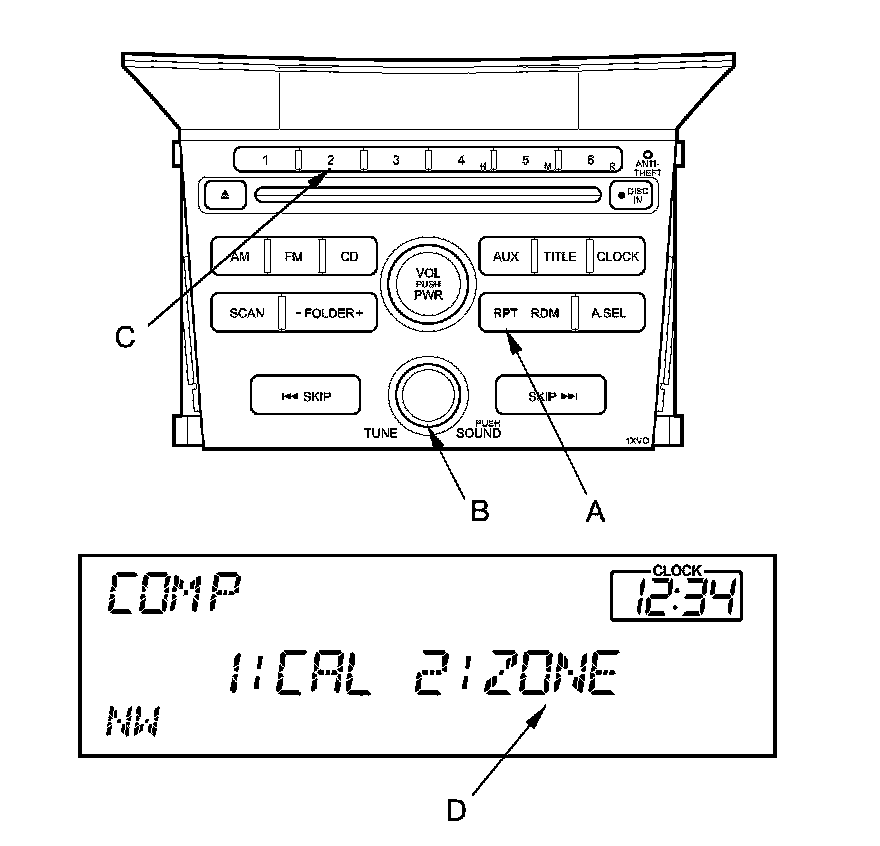 1. Turn the ignition switch to ON (II), then press and hold the RPT button (A) and SOUND knob (B) for 2 seconds and changing the display.
