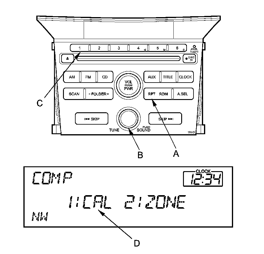 6. Press the preset No. 1 button (C) to select CAL (D) and enter the selection.