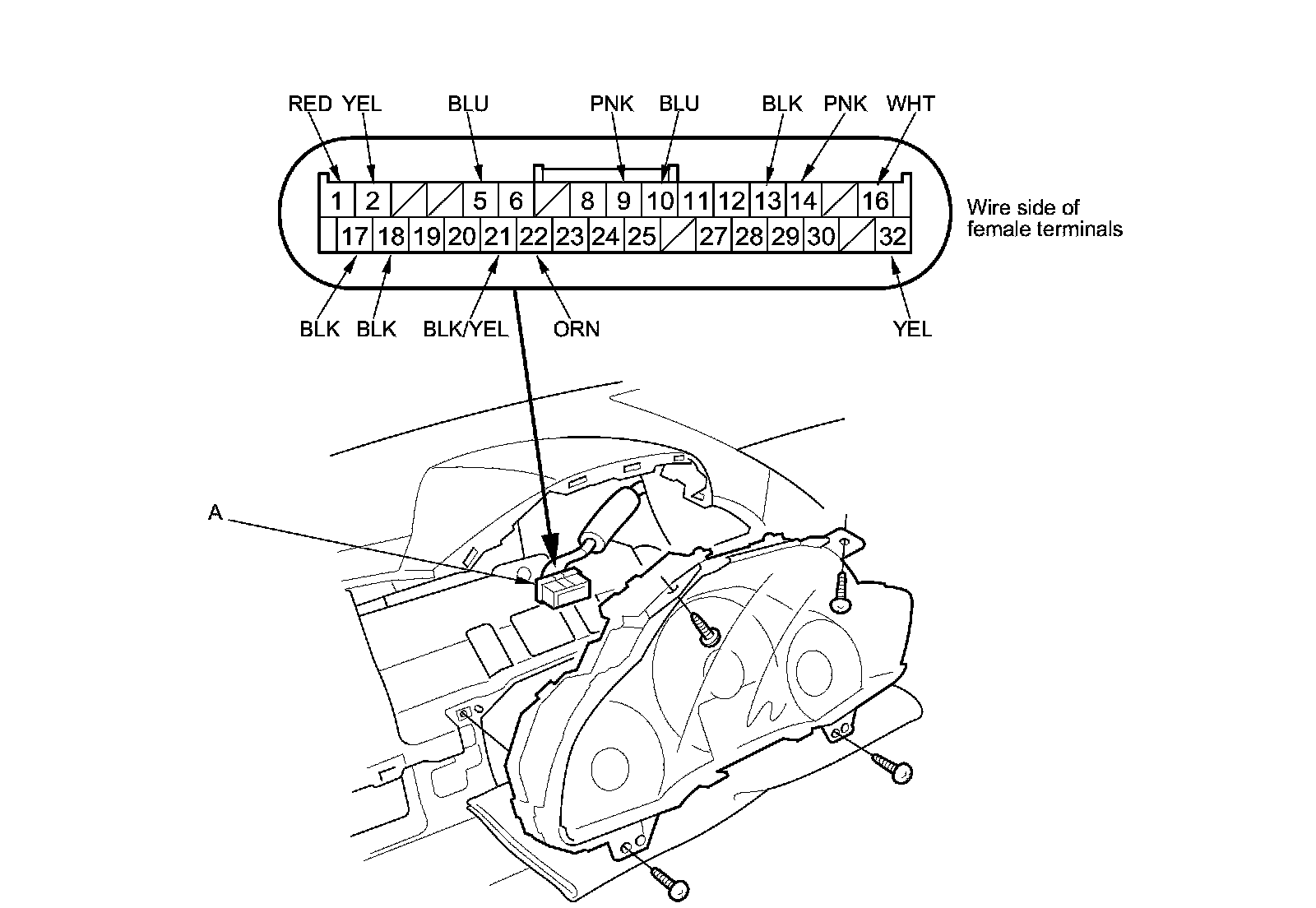 2. Remove the gauge control module Service and Repair, and disconnect the 32P connector (A) from it.