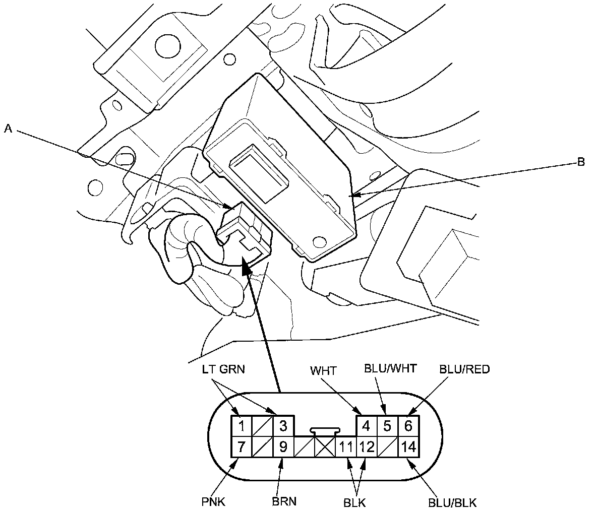 2. Disconnect the 14P connector (A) from the automatic lighting control unit (B).