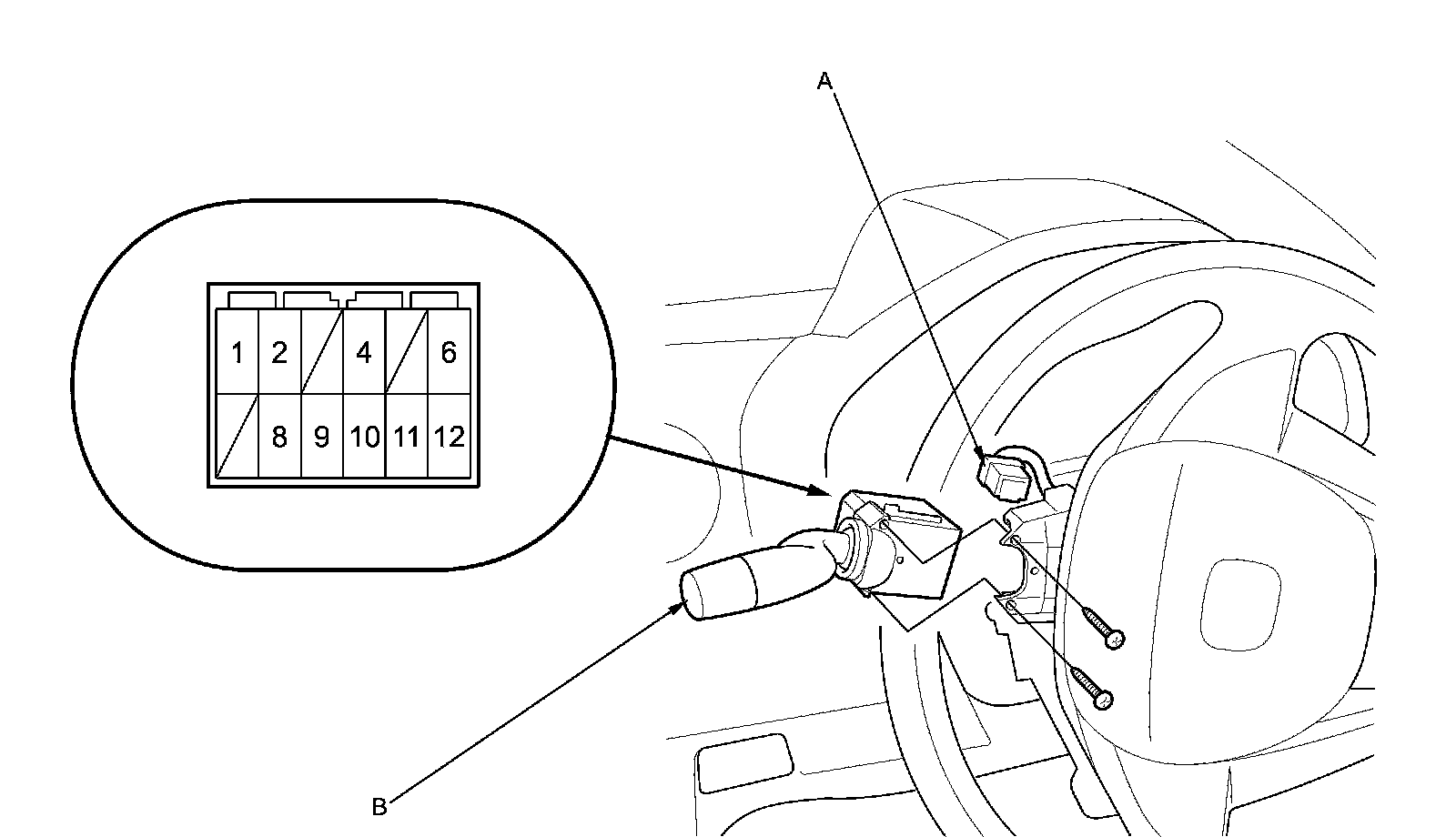 2. Disconnect the 12P connector (A) from the combination light switch (B).