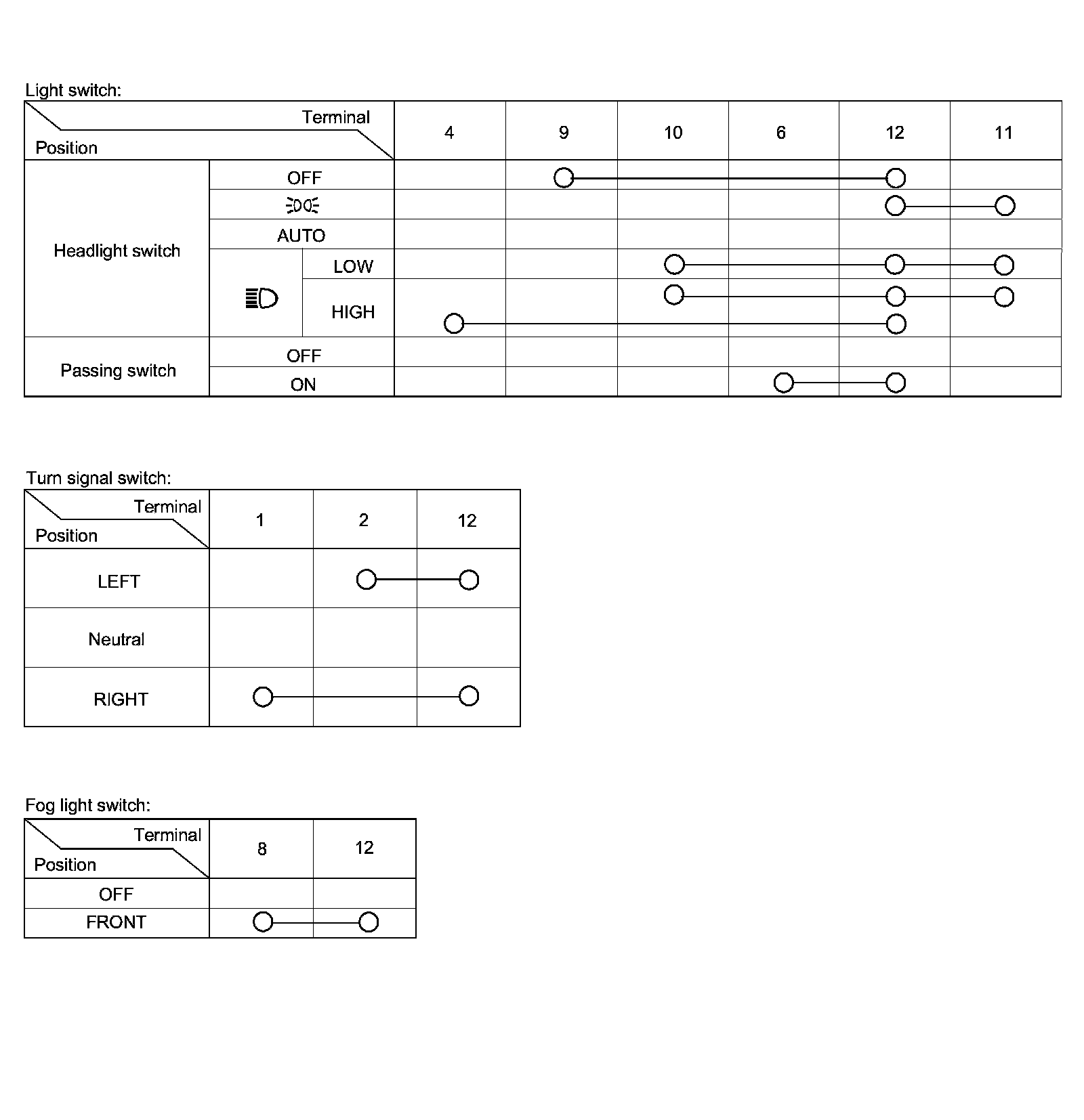 - If the terminals look OK, check for continuity between the terminals in each switch position according to the tables.