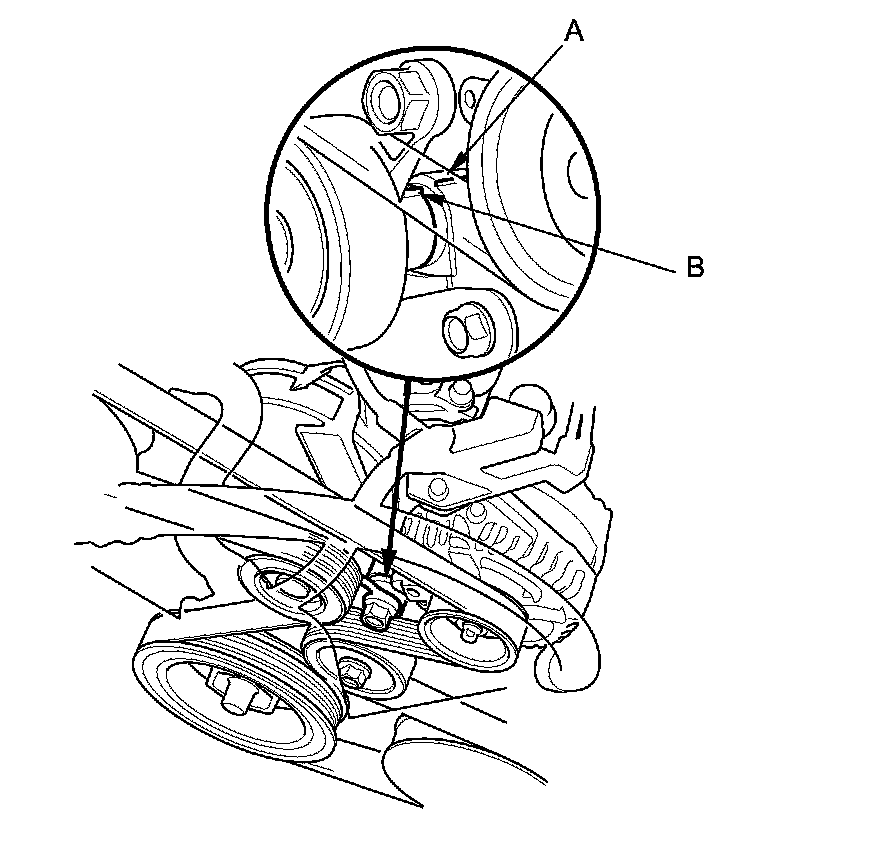 3. Check that the position of the auto-tensioner indicator pointer (A) on the A/C compressor bracket is not beyond the edge of the indicator (B) on the auto-tensioner. If the pointer is beyond the indicator, replace the drive belt Service and Repair.