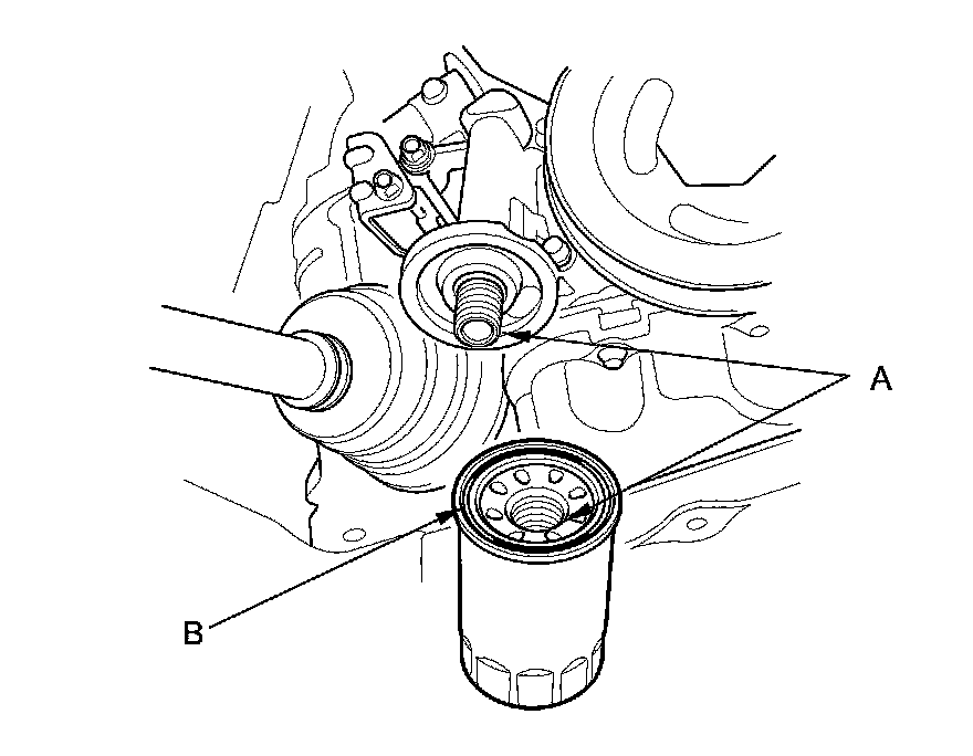 3. Inspect the threads (A) and the rubber seal (B) on the new filter. Clean the seat on the oil filter base, then apply a light coat of new engine oil to the filter rubber seal. Use only filters with a built-in bypass system.