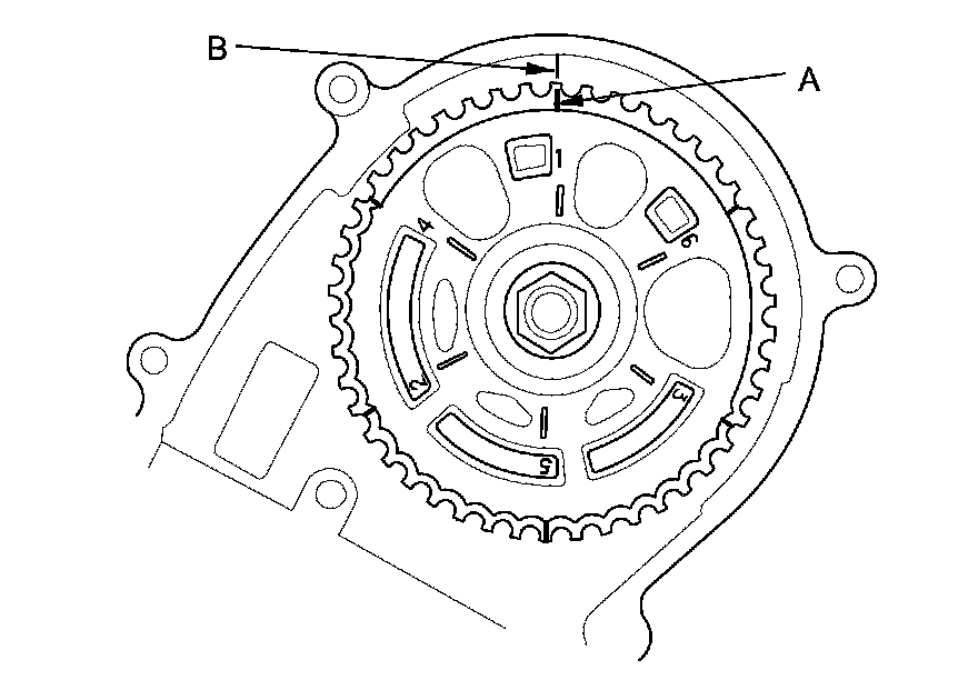 3. Set the timing belt drive pulley to top dead center (TDC) by aligning the TDC mark (A) on the tooth of the timing belt drive pulley with the pointer (B) on the oil pump.