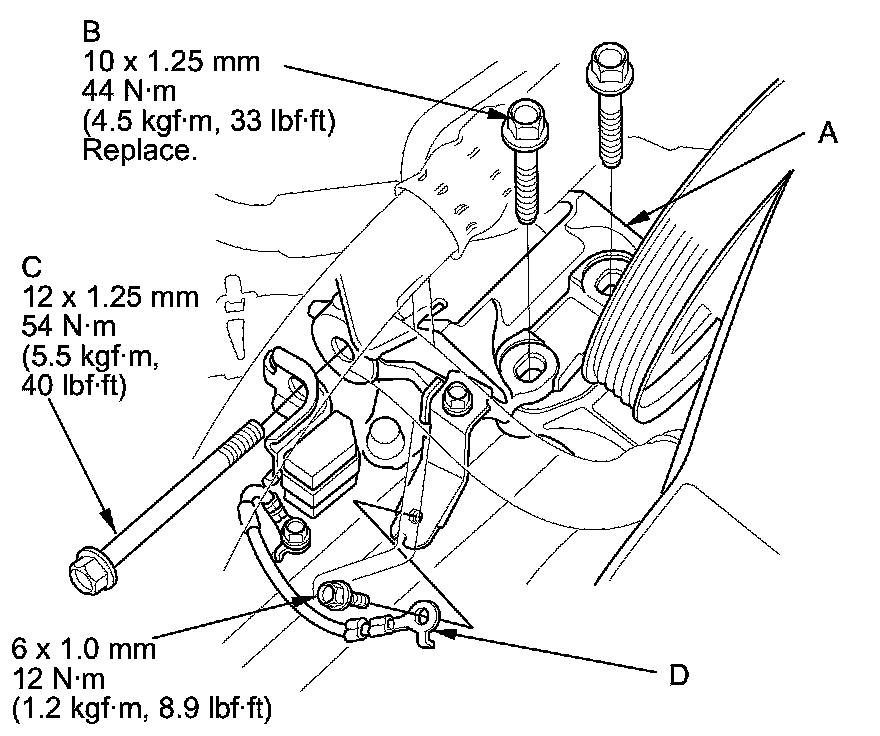 24. Install the upper half of the side engine mount bracket (A), and tighten the new mounting bolts (B), then tighten the mass damper mounting bolt (C).