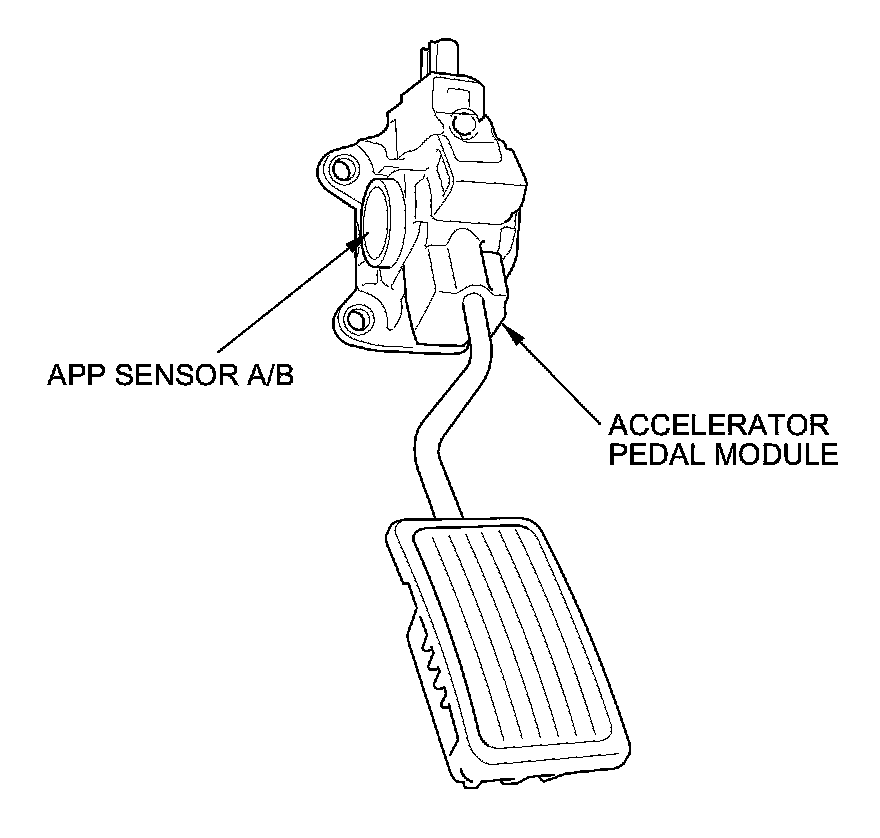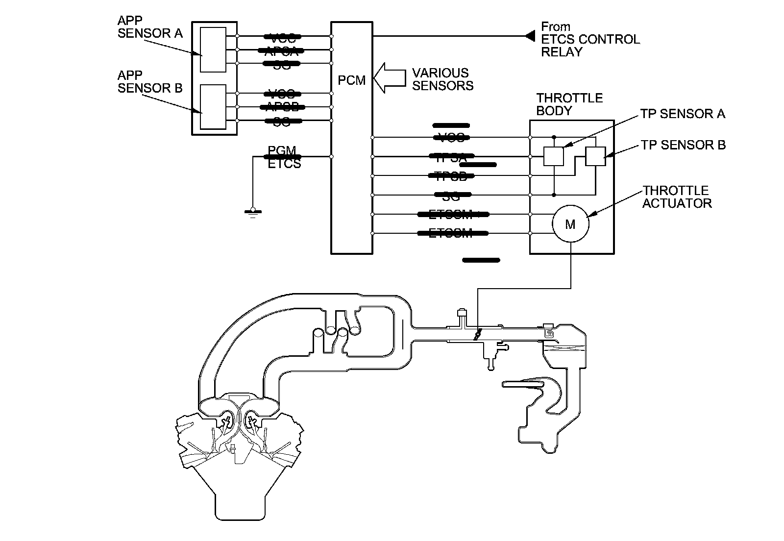 The electronic throttle control system consists of the throttle actuator, throttle position (TP) sensor A/B, accelerator pedal position (APP) sensor A/B, the electronic throttle control system (ETCS) control relay, and the PCM.