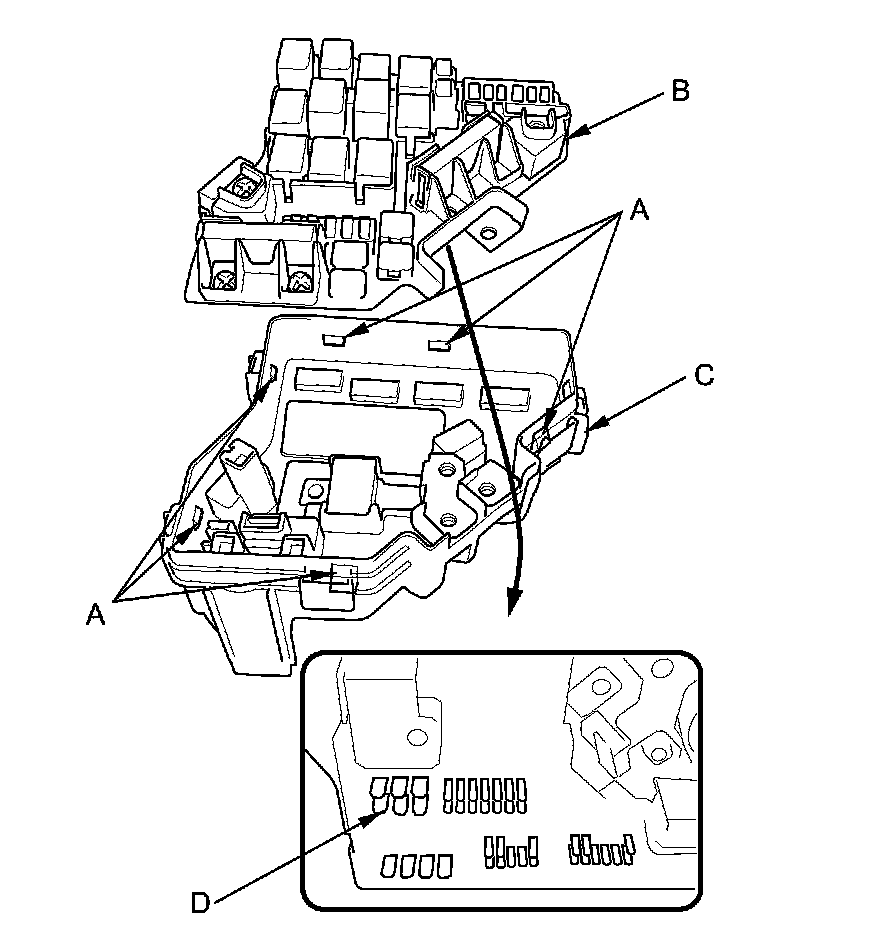 4. Turn the housing over again. Using two flat-tip screwdrivers, release the tabs (A), and pry up the fuse/relay box base (B) from the fuse/relay box housing (C).