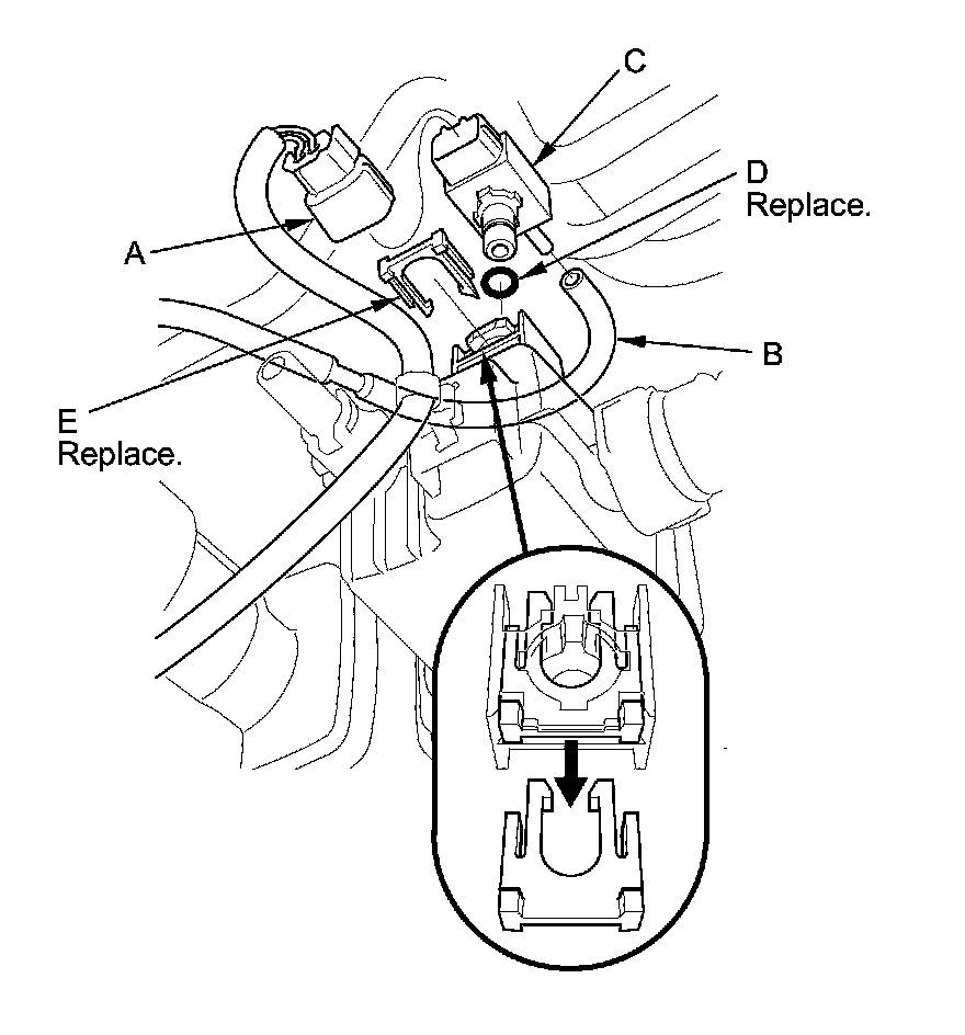 Install the parts in the reverse order of removal with a new O-ring (D) and a new retainer (E).