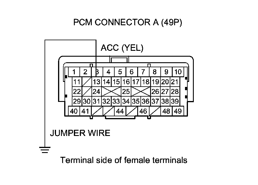 13. Momentarily connect PCM connector terminal A13 to body ground with a jumper wire several times.