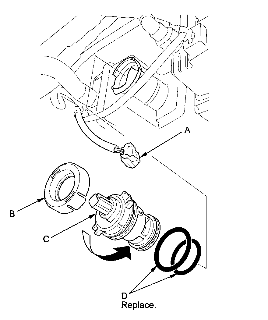 Install the parts in the reverse order of removal with new O-rings (D) and a new cap.