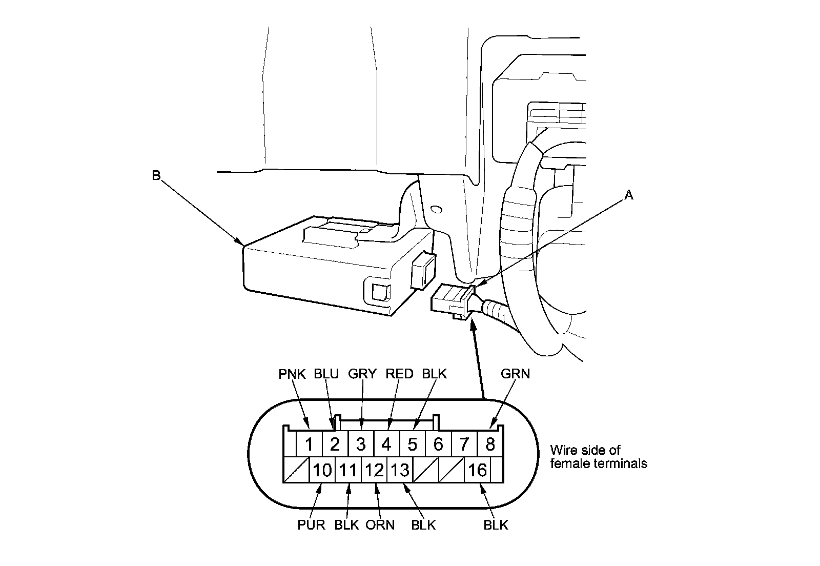 2. Disconnect the 16P connector (A) from the parking and back-up sensor control unit (B).