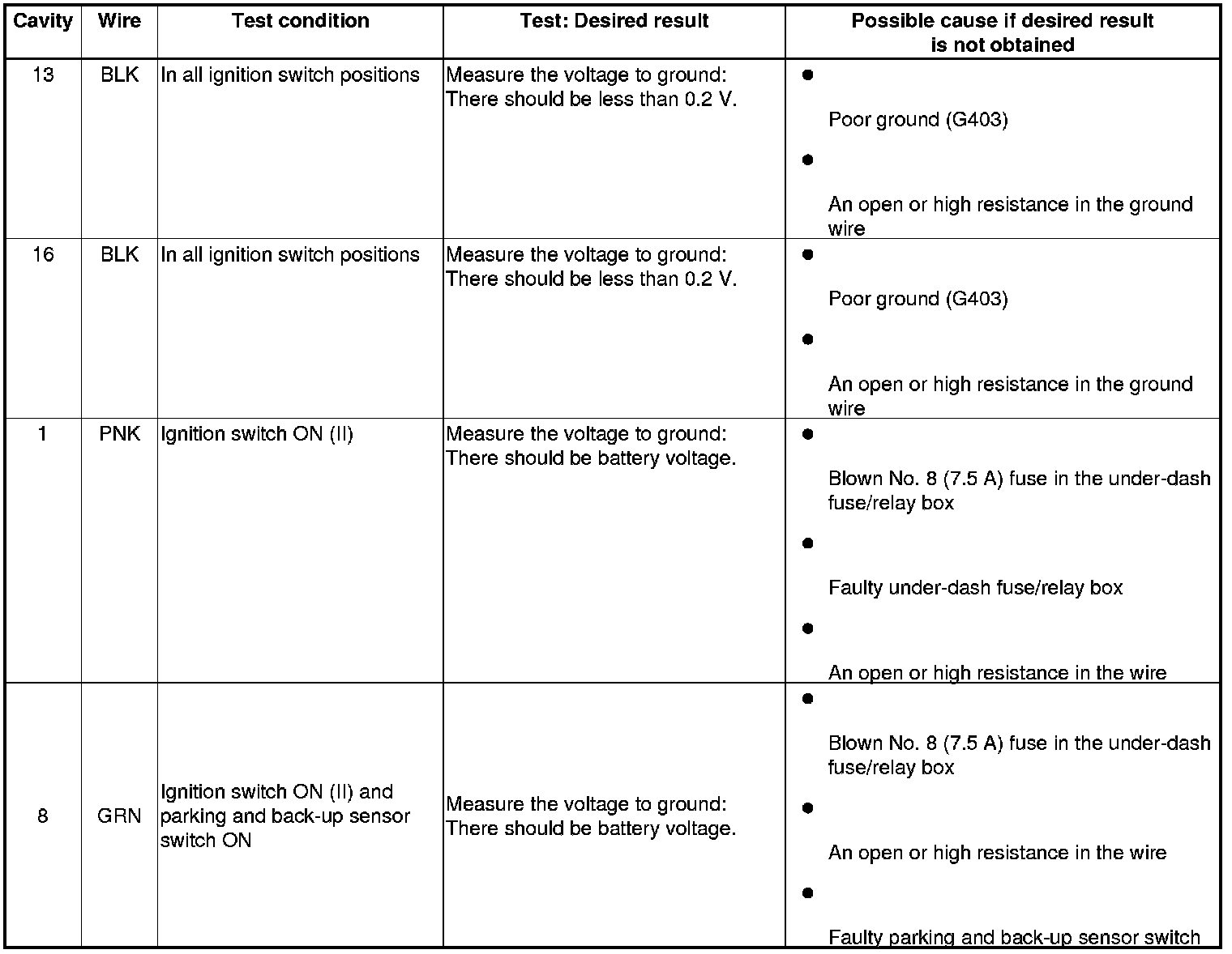 5. Reconnect the 16P connector to the parking and back-up sensor control unit, and do the following input tests.
