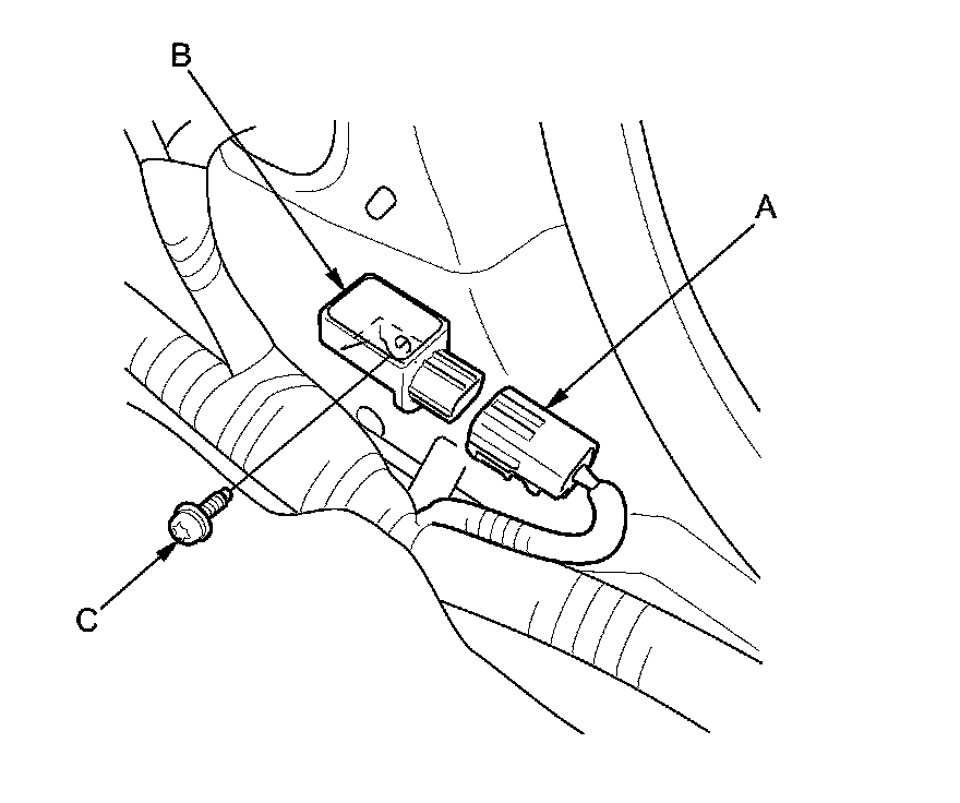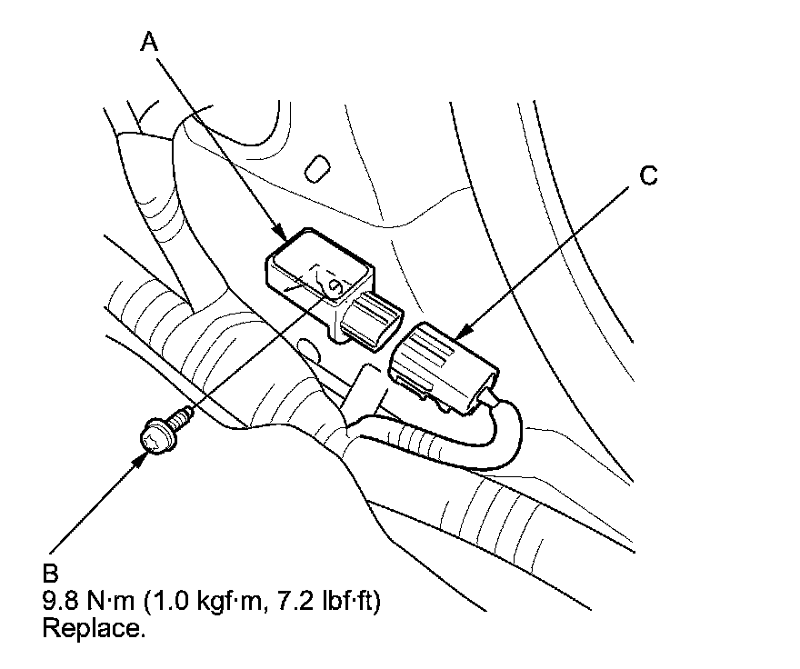 1. Install the side impact sensor (first) (A) with a new TORX bolt (B), then connect the floor wire harness 4P connector (C) to the side impact sensor (first).
